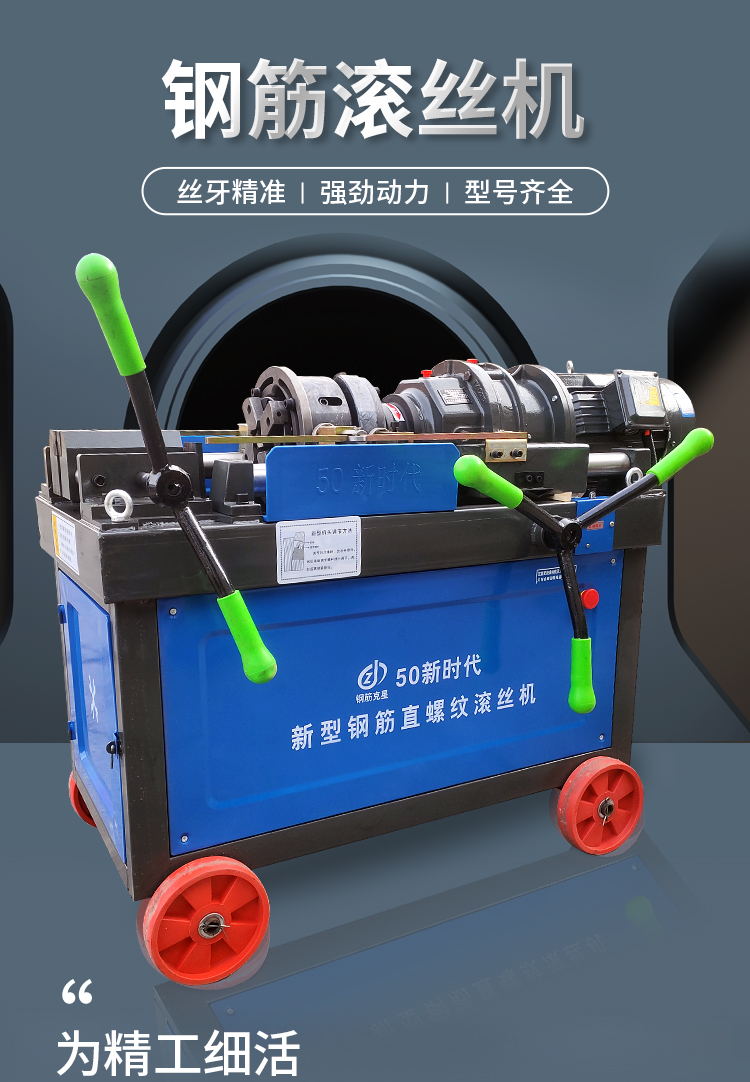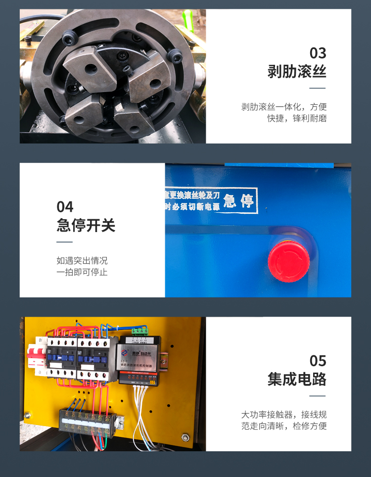 滾絲機是用切削與滾軋螺紋一次成形來達到鋼筋端頭強化和螺紋加工的目的,解決了鋼筋在加工前鋼筋端頭進行預(yù)處理的問題,以及同類的設(shè)備需多次數(shù)軋成的問題,這樣現(xiàn)場減少了工序加工和多次鋼筋搬運,提高了現(xiàn)場生產(chǎn)加工效率;滾絲機利用一個滾絲頭可實現(xiàn)對多種規(guī)格鋼筋進行滾軋加工,解決了同類設(shè)備對鋼筋端頭加工直螺紋需每種規(guī)格一個滾絲頭的狀況。滾絲機采用內(nèi)出冷卻液,解決了滾軋加工時排屑問題,自動化強度高,進給自動停機復(fù)位自動停機。鋼筋剝肋直螺紋滾絲機是加工鋼筋直螺紋絲頭的專用設(shè)備,通過剝肋刀將鋼筋端頭剝圓,然后用三個空心滾絲輪對鋼筋進行滾軋直螺紋,從而達到鋼筋直螺紋成型的質(zhì)量要求。使帶肋鋼筋直螺紋連接接頭達到JGJI07-2003《鋼筋機械連接通用技術(shù)規(guī)程》要求的A級連接標準要求。