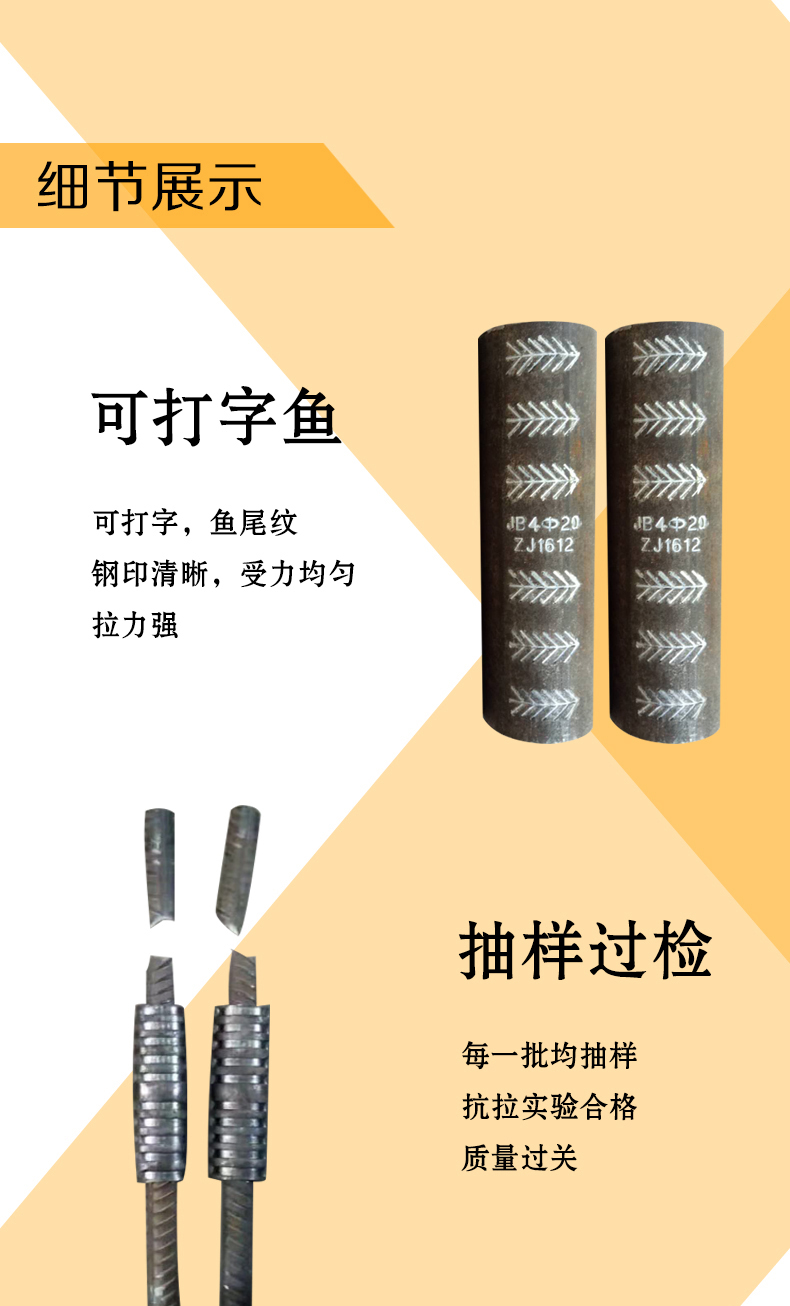 (5)外觀檢查不合格數(shù)小于檢查書的10%時,該批接頭外觀質(zhì)量評定為合格,當不合格數(shù)超過被檢查數(shù)的10%時,應(yīng)對該批接頭逐個復(fù)檢,外觀檢查不合格的接頭應(yīng)該采取補救措施,不能補救的應(yīng)該做好標記,并且在不合格的機頭中抽取3個試件作抗拉試驗,若有一個試件的強度低于設(shè)計值,則該批接頭不合格。