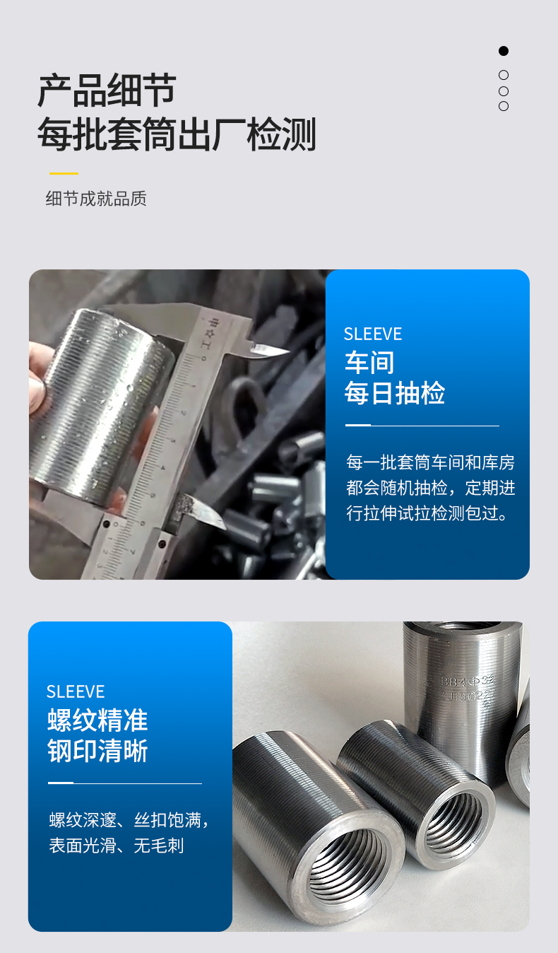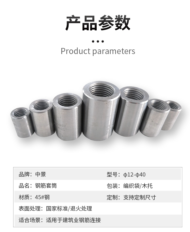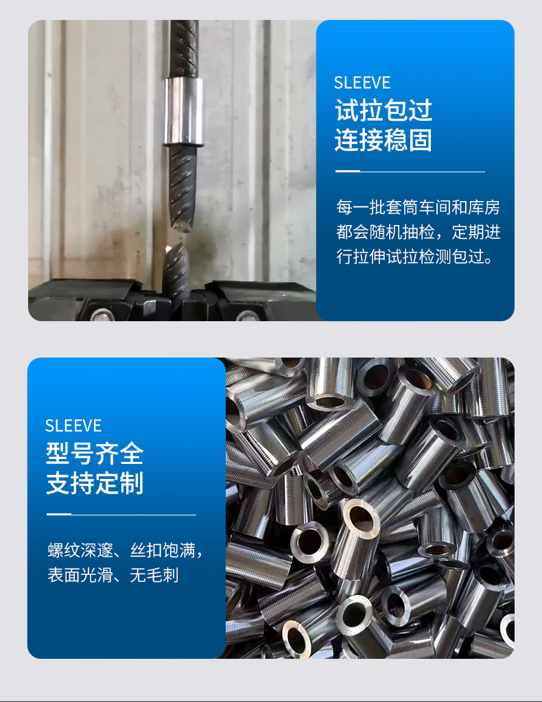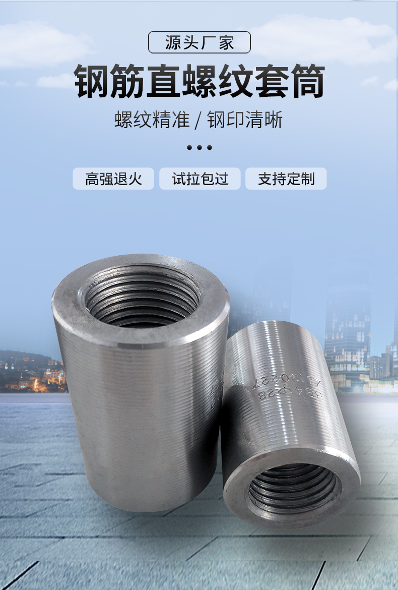 鋼筋直螺紋套筒具有連接強度高,連接質(zhì)量穩(wěn)定可靠;、施工方便、連接速度快;環(huán)保施工等優(yōu)點。