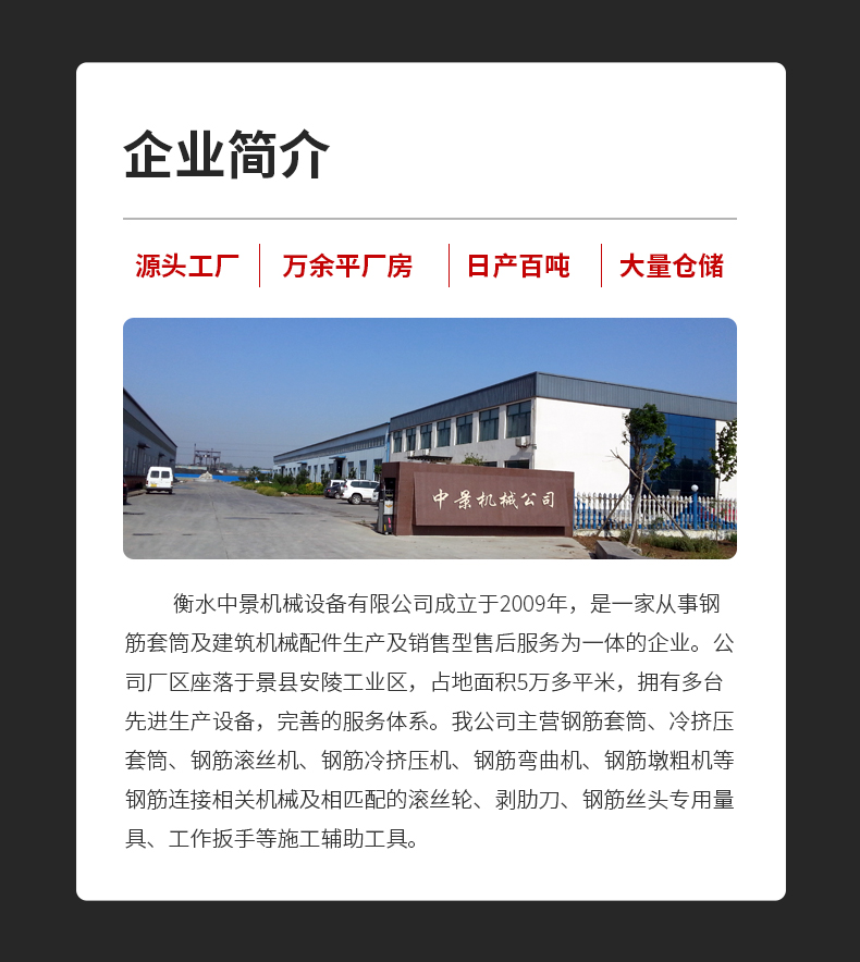 2、施工方便、連接速度快。鋼筋絲頭加工工廠化作業(yè),不占用施工工期?,F(xiàn)場連接裝配作業(yè),占用時間短。鋼筋絲頭加工簡單。鋼筋一次裝卡即可完成剝肋、滾壓螺紋兩道工序,加工速度快,成型螺紋精度高。適用范圍廣。對鋼筋無可焊性要求,適用于直徑14~50mmHRB335、HRB400鋼筋在任意方位的同、異徑連接。